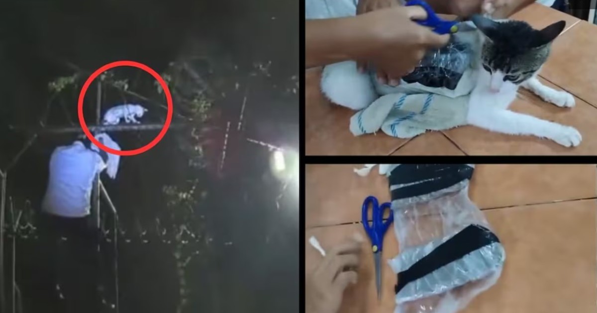 Un video compartido por el ministerio muestra a un guardia encaramado en la reja para atrapar al gato de color blanco con manchas negras.